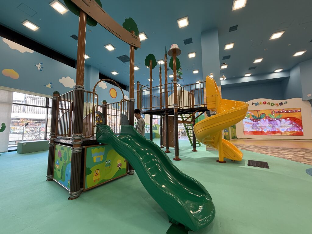 左側は「みぃつけた」のキャラクターたち。写真にはないのですが奥にはサボさんもいました。そこには大きいお子様用のボルダリングや写真にある滑り台など遊具が置いてあります。