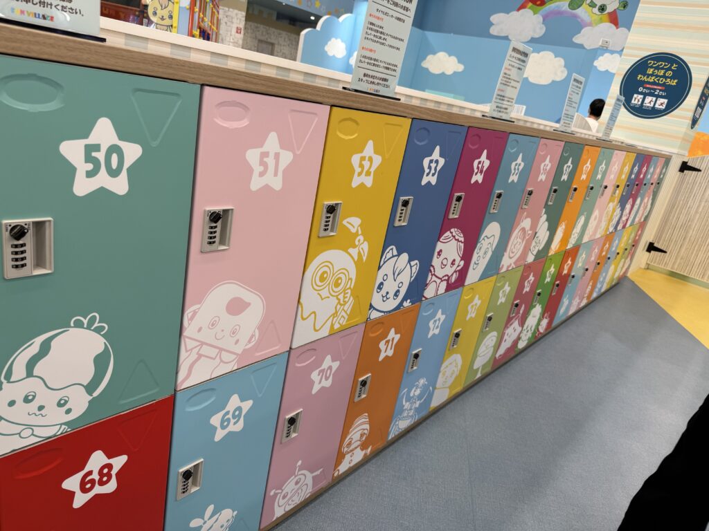 受付を済ませてゲートを通ると、左側にベビーカー置き場・右側にロッカーがあります。ロッカーに荷物、靴をしまっていざNHKキャラクターズへ!