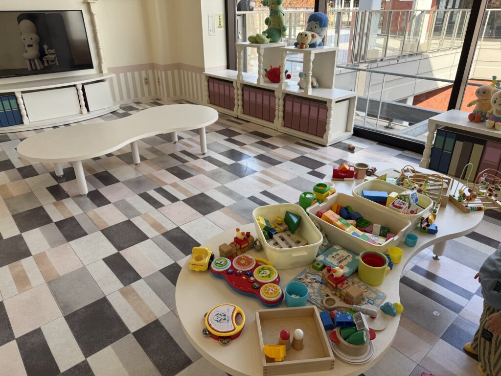 モニター左側の1番奥にはおもちゃで遊べるコーナーがありました。我が子はすぐに口に入れてしまうのでここは長居ができず…
